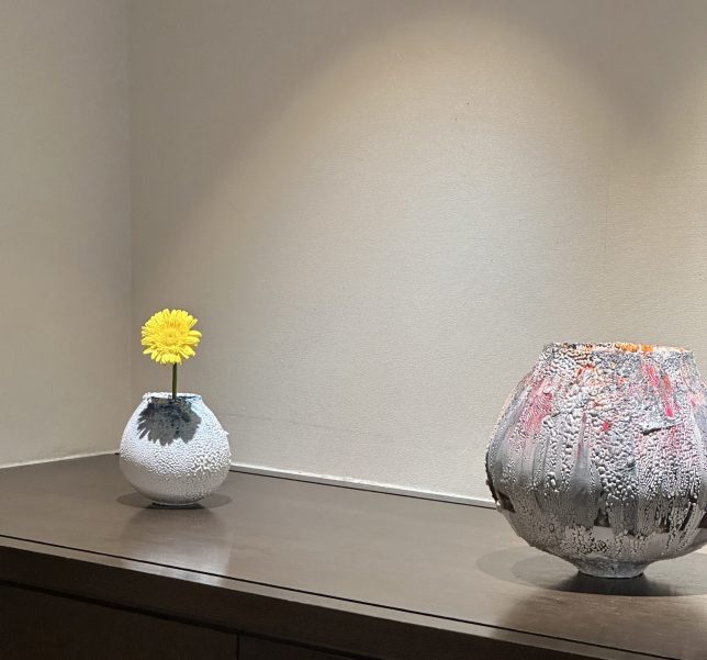 ぐい呑は早々に完売し、壺や花入も多くの方にじっくりとご覧いただくことができました。作品一つひとつと丁寧に向き合ってくださるお客様の姿に、作家も大きな励みをいただいたようです。