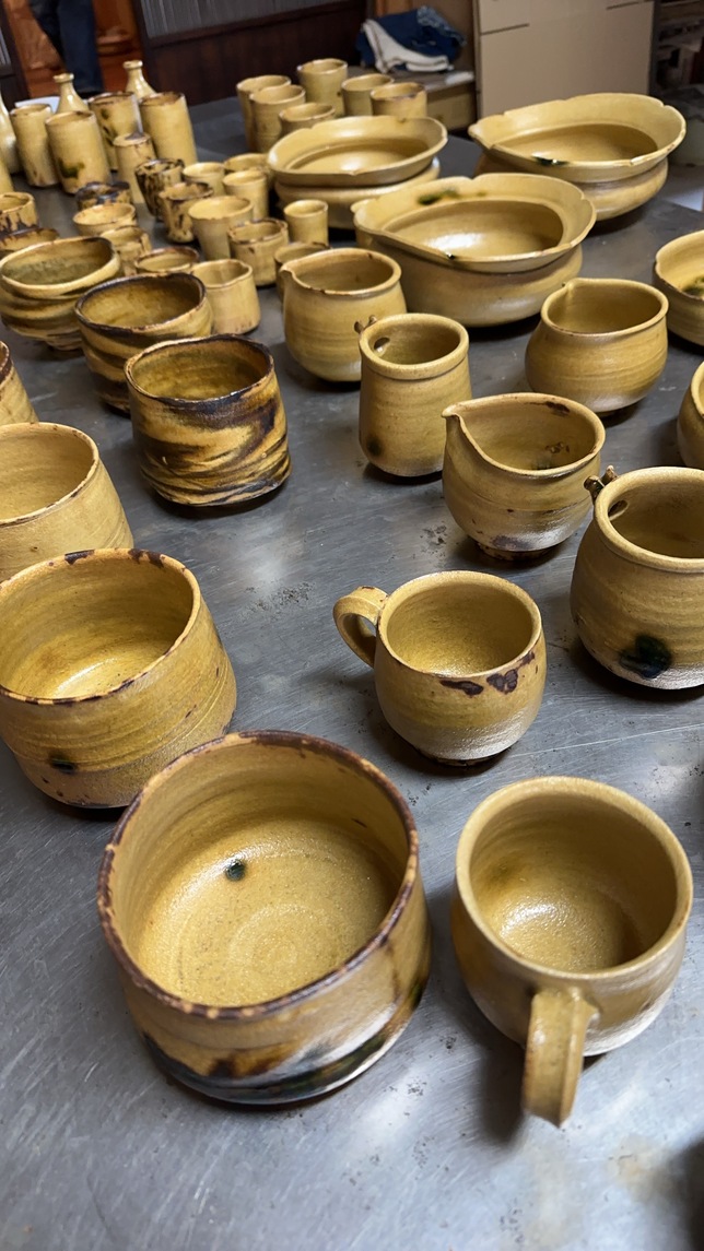 昨日4月11日からギャラリーふじもとさんで開催する各務賢周展の作品選定を、先生宅にて行なってまいりました。今回も各務先生らしい落ち着きと深みのある黄瀬戸作品ばかりです。